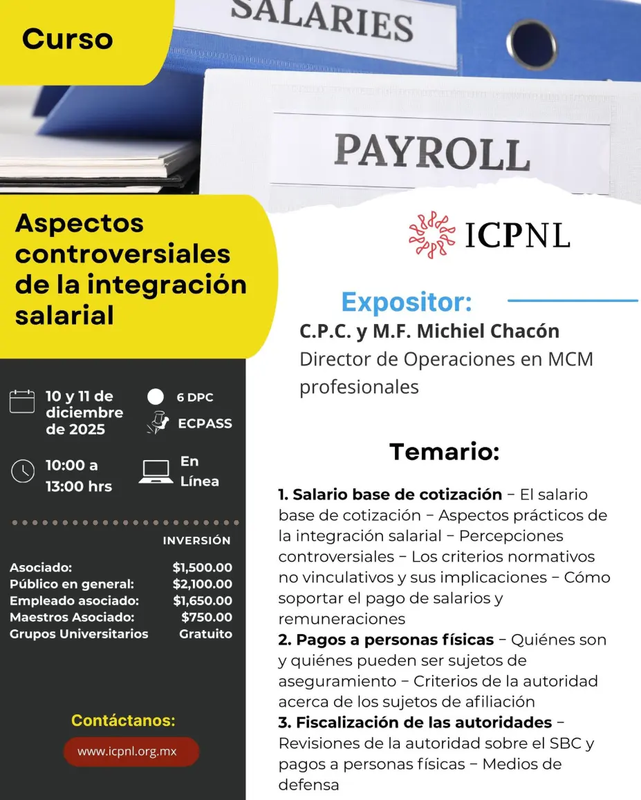 Aprende a integrar, en forma adecuada, tus salarios base de cotización, a efecto de disminuir riesgos en el cumplimiento de tus obligaciones ante el Seguro Social, documentando adecuadamente conforme a la ley y reglamentos de la materia, así como los criterios normativos, el otorgamiento de remuneraciones a los trabajadores y los pagos a personas físicas.