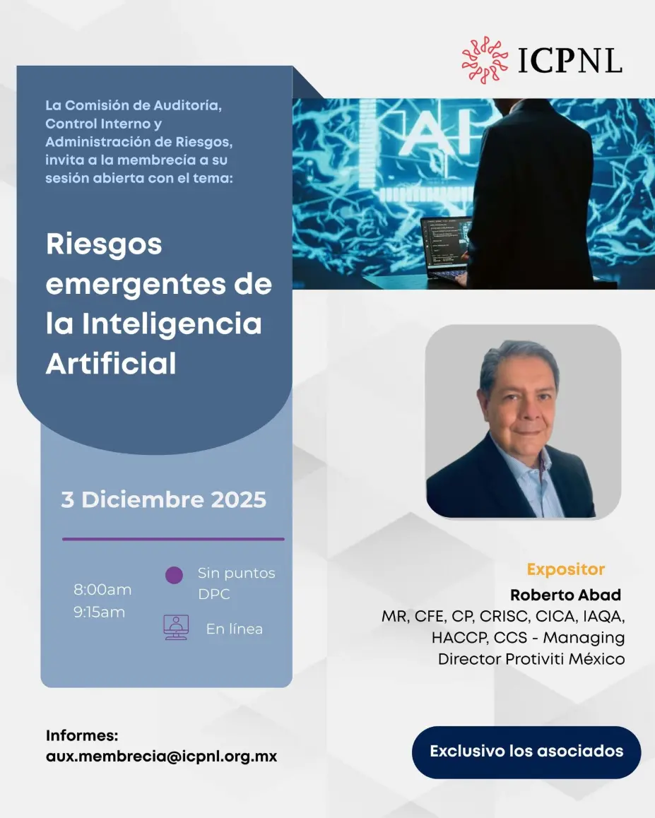 La Comisión de Auditoria, Control Interno y Administración de Riesgos, invita a la membrecía a su sesión abierta con el tema: AP Riesgos emergentes de la Inteligencia Artificial