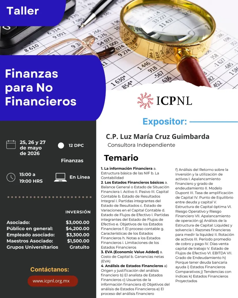 Evento en Línea - Fechas: 25, 26 y 27 demayo de 2026 - Horario: 15:00 a 19:00 hrs. DPC: 12 Materia: Finanzas