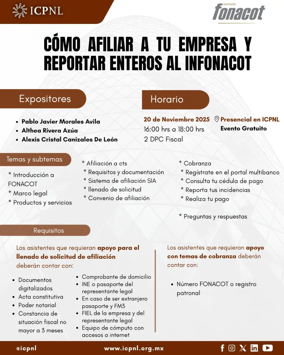 Evento Presencial - Fecha: 20 de noviembre del 2025 - Horario: 16:00 a 18:00hrs - DPC: 2 - Materia: Fiscal