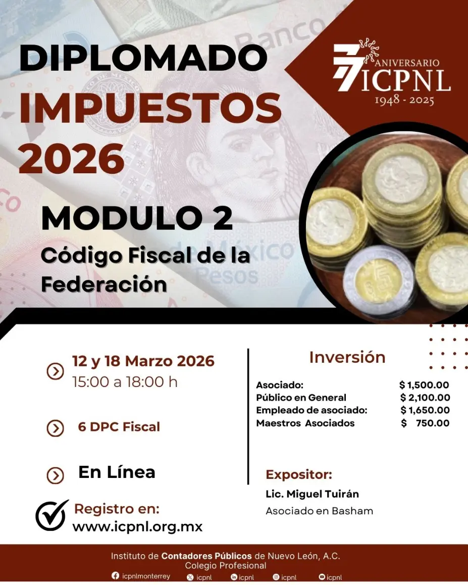 Evento en Línea - Fecha: 12 y 18 de marzo del 2026 - Horario: 15:00 a 18:00hrs - DPC: 6 - Materia: Fiscal