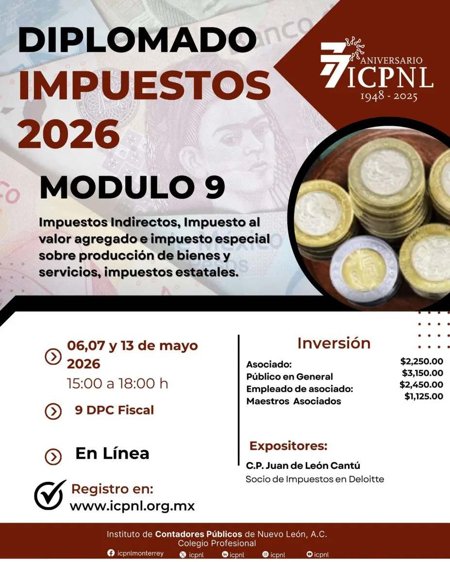 Evento en Línea - Fecha: 06, 07 y 13 de mayo del 2026 - Horario: 15:00 a 18:00hrs - DPC: 9 - Materia: Fiscal