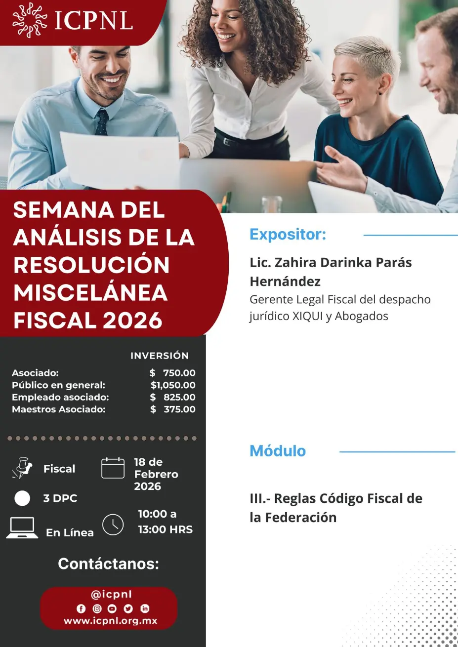 Evento en Línea- Fecha: 18 de febrero del 2026- Horario: 10: 00 a 13:00hrs - DPC: 3 - Materia: Fiscal