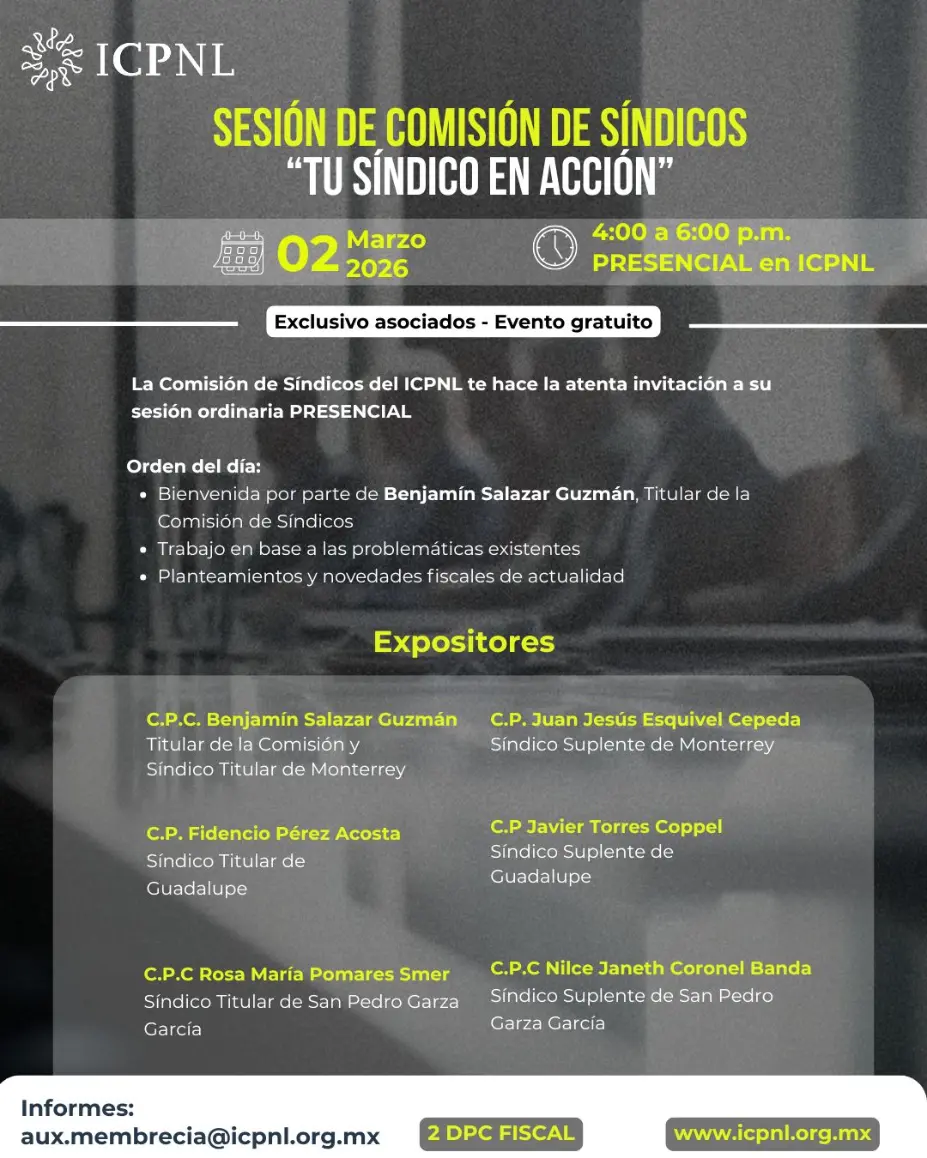 La Comisión de Síndicos del ICPNL te hace la atenta invitación a su sesión ordinaria PRESENCIAL: "TU SÍNDICO EN ACCIÓN"