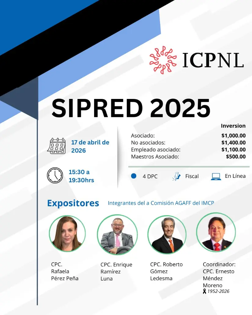 Evento en Línea - Fecha: 17 de abril del 2026 - Horario: 15:30a 19:30hrs - DPC: 4 - Materia: FISCAL