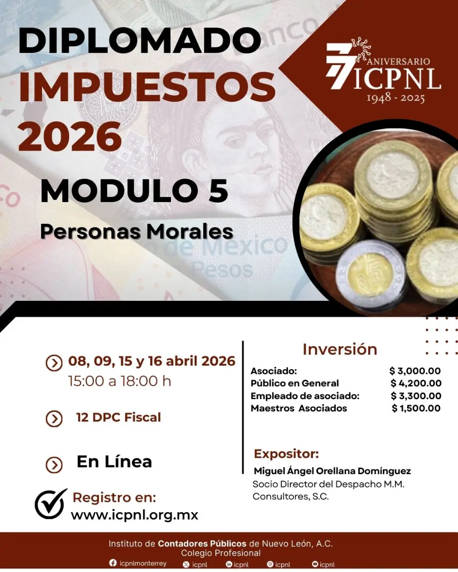 Evento en Línea - Fecha: 08,09, 15 y 16 de abril del 2026 - Horario: 15:00 a 18:00hrs - DPC: 12 - Materia: Fiscal