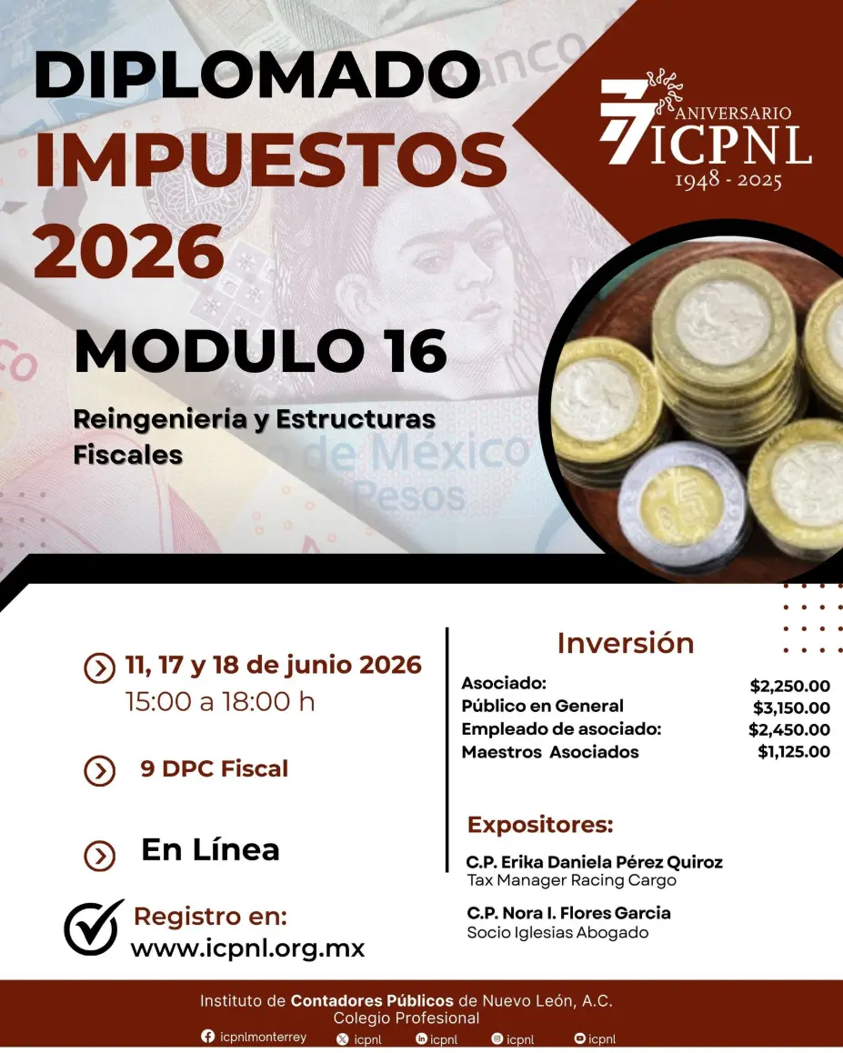 Evento en Línea - Fecha: 11, 17 y 18 de junio del 2026 - Horario: 15:00 a 18:00hrs - DPC: 9 - Materia: Fiscal