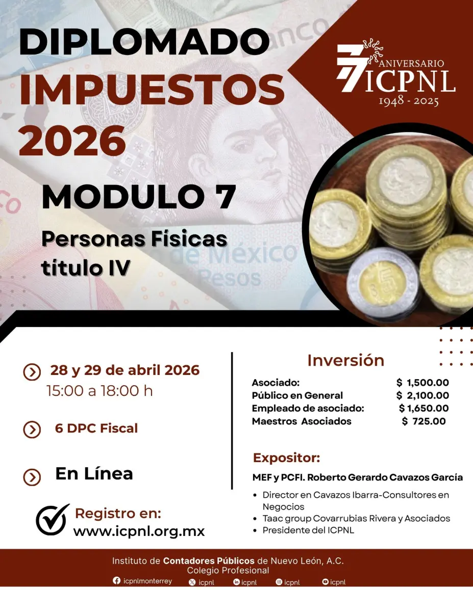 Evento en Línea - Fecha: 28 y 29 de abril del 2026 - Horario: 15:00 a 18:00hrs - DPC: 6 - Materia: Fiscal
