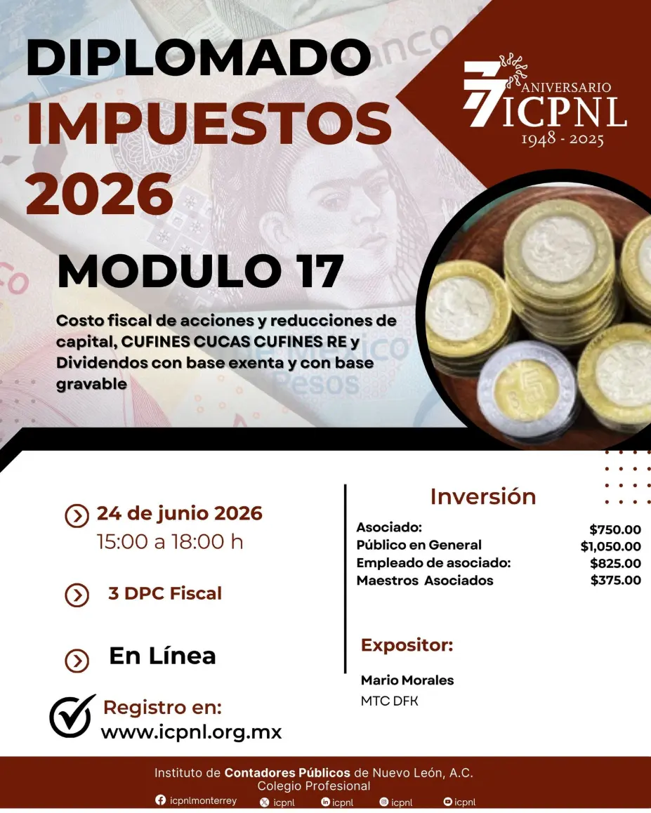 DIPLOMADO EN IMPUESTOS 2026 - XVII.- Costo fiscal de acciones y reducciones de capital, CUFINES CUCAS CUFINES RE y Dividendos con base exenta y con base gravable